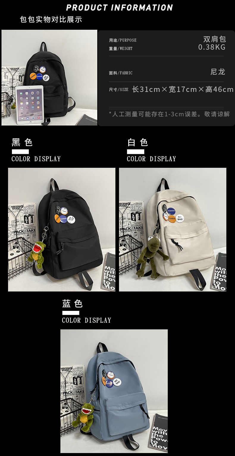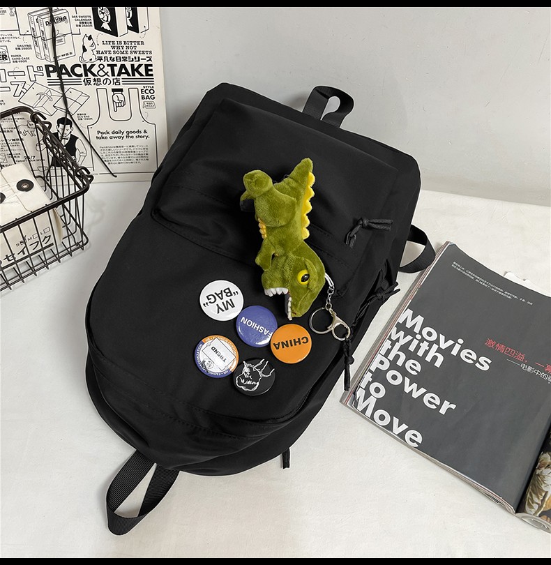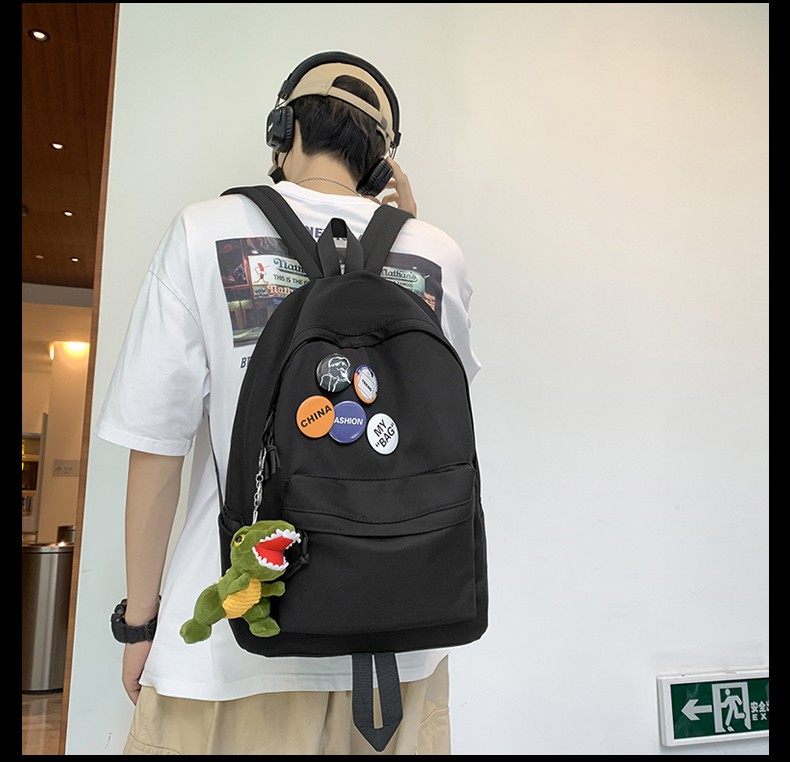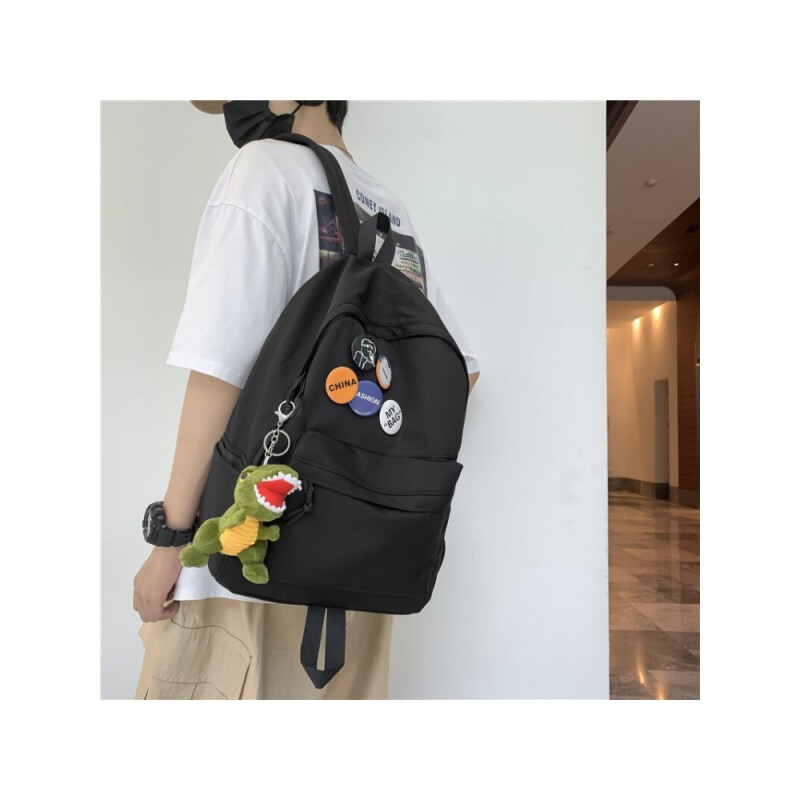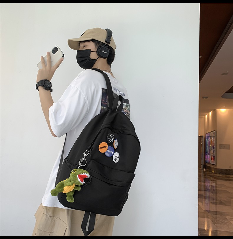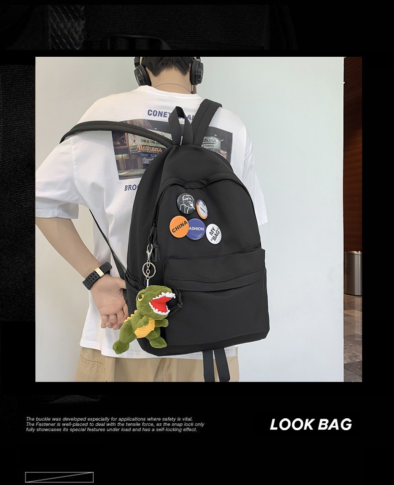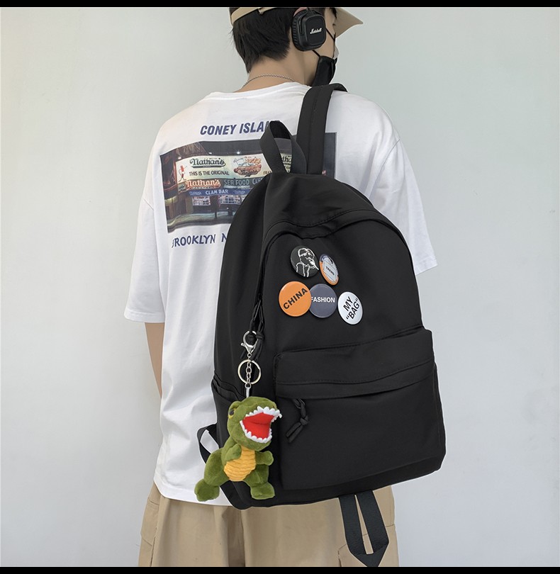 商品名称:酷森书包男初中韩版原宿风高中大学生背包 防泼水尼龙帆布大容量双肩包女 防刮耐磨笔记本电脑包 黑色(带大恐龙挂件+5枚徽章)