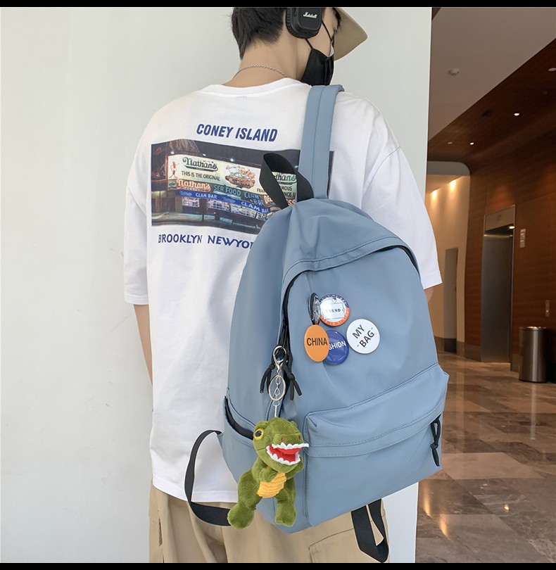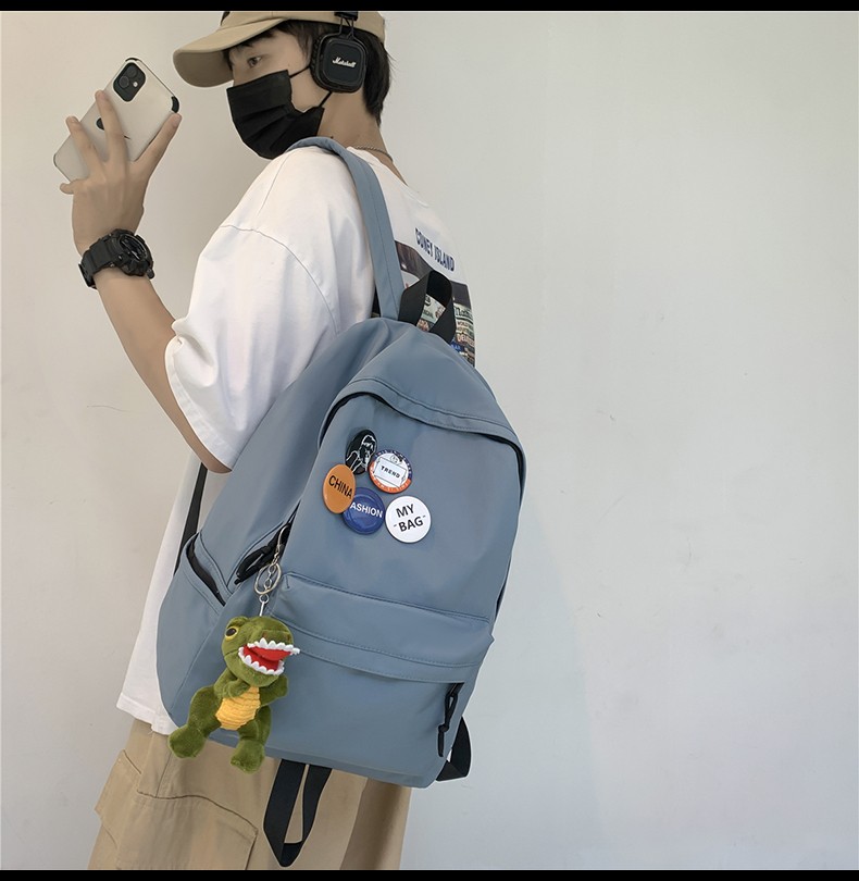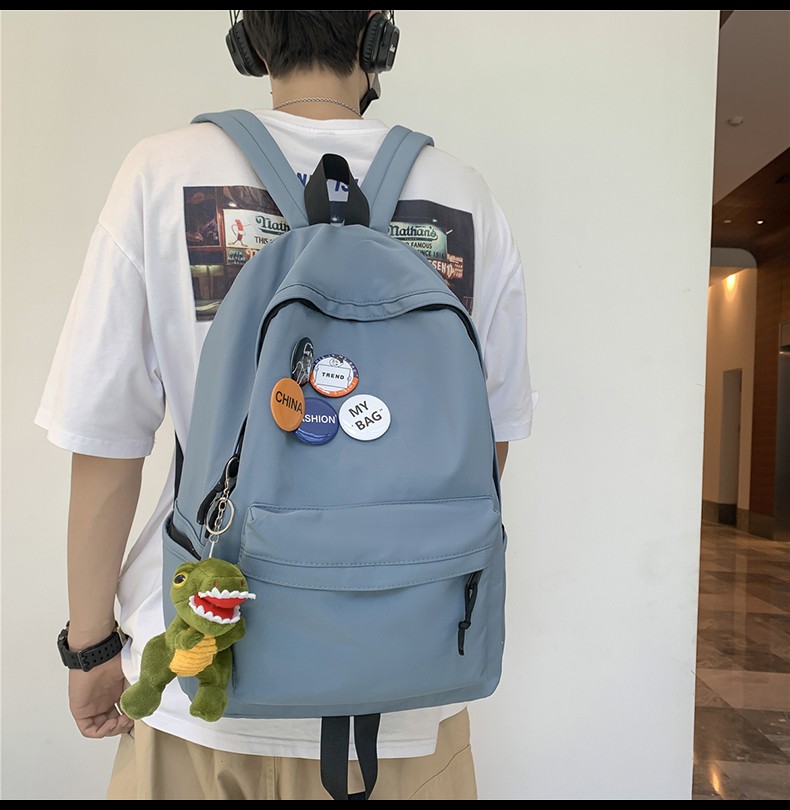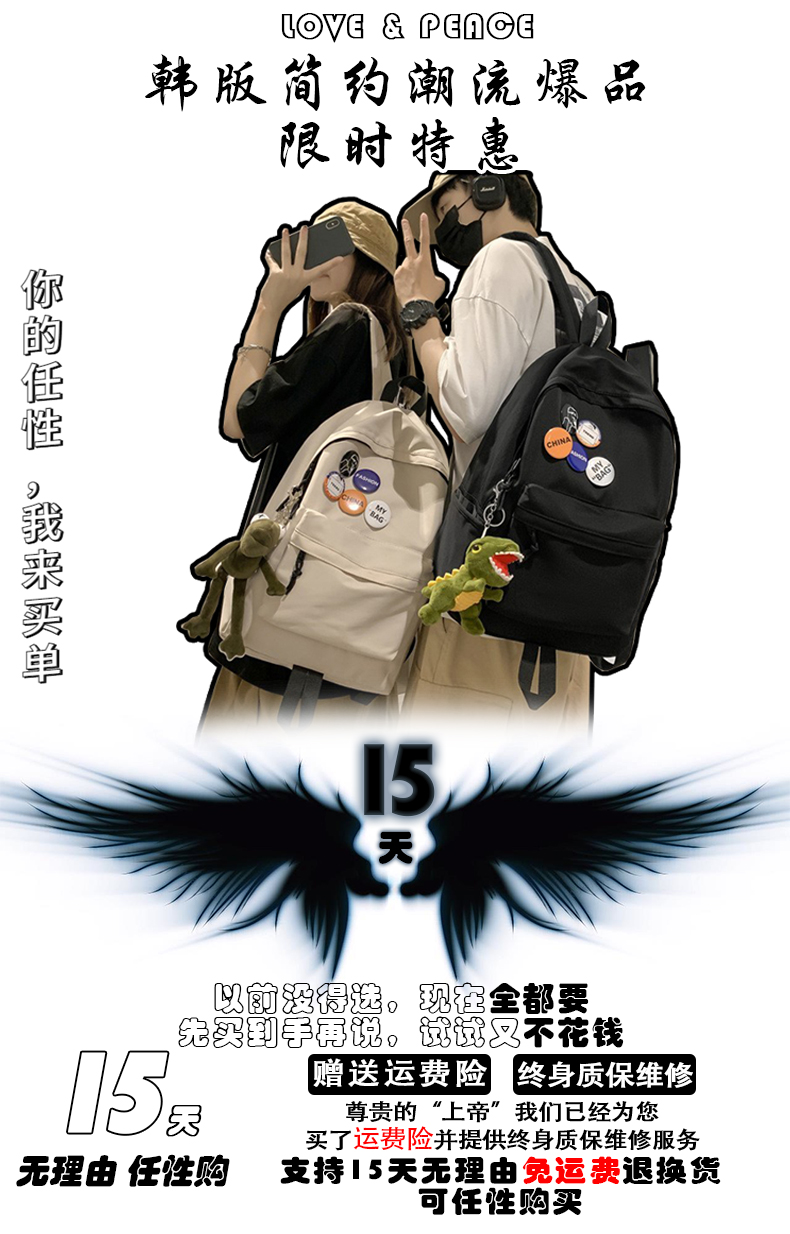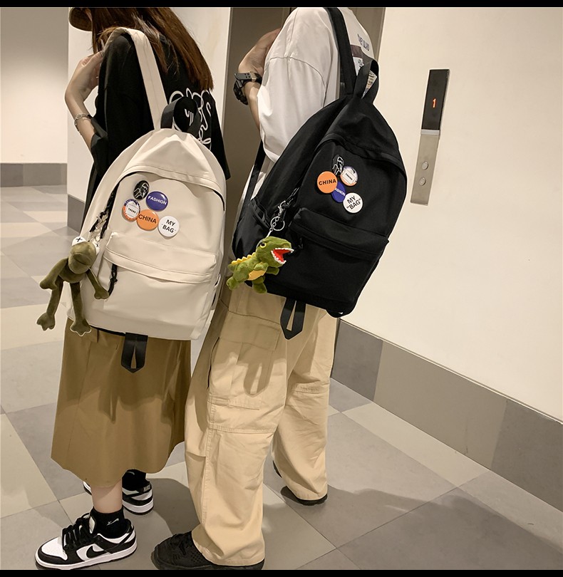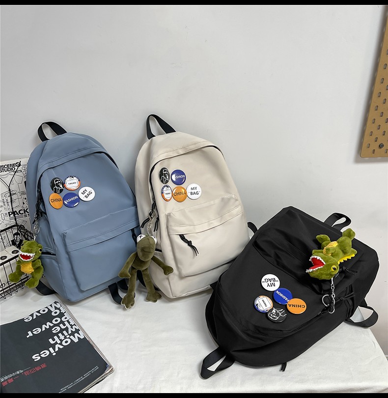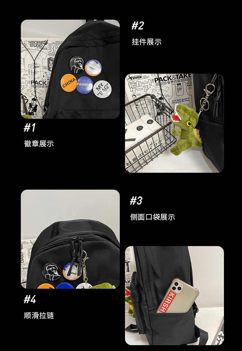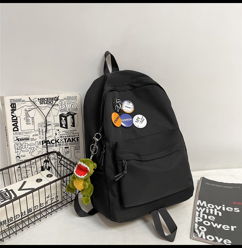 商品名称:酷森书包男初中韩版原宿风高中大学生背包 防泼水尼龙帆布大容量双肩包女 防刮耐磨笔记本电脑包 黑色(带大恐龙挂件+5枚徽章)