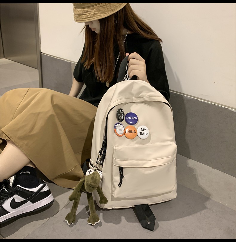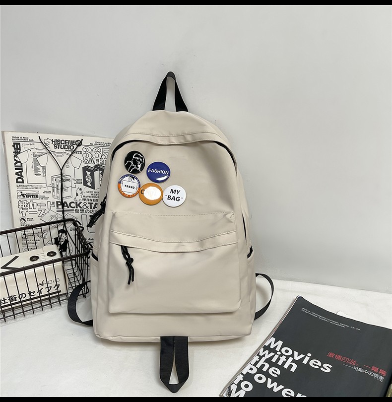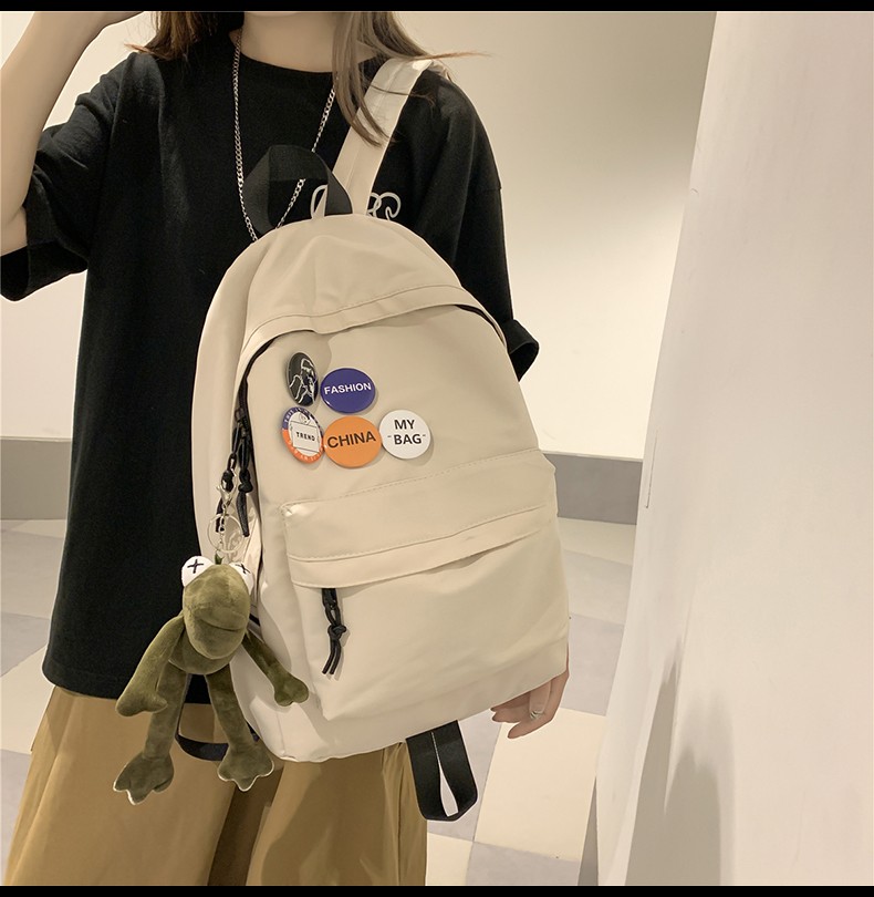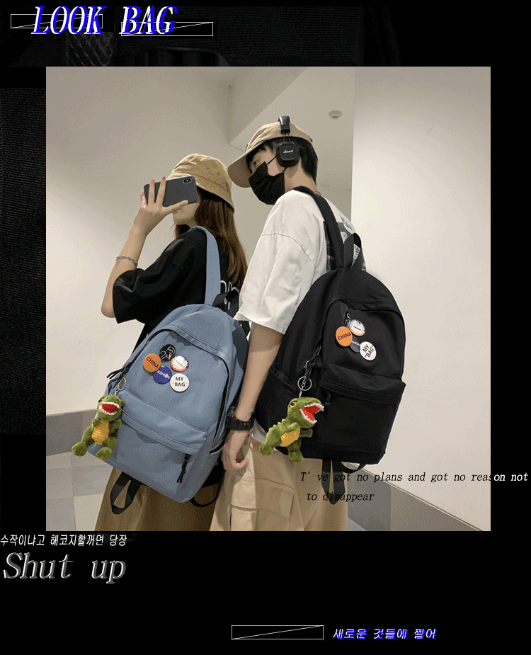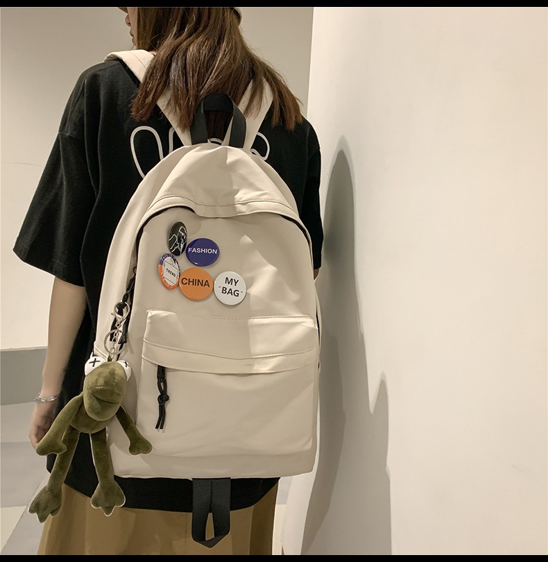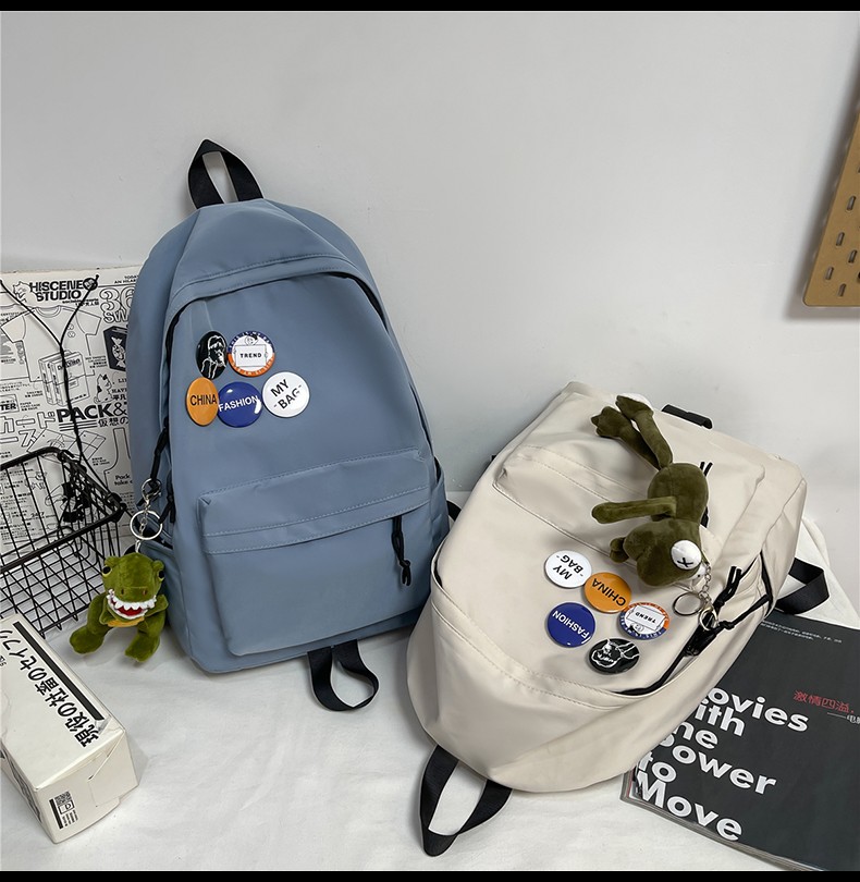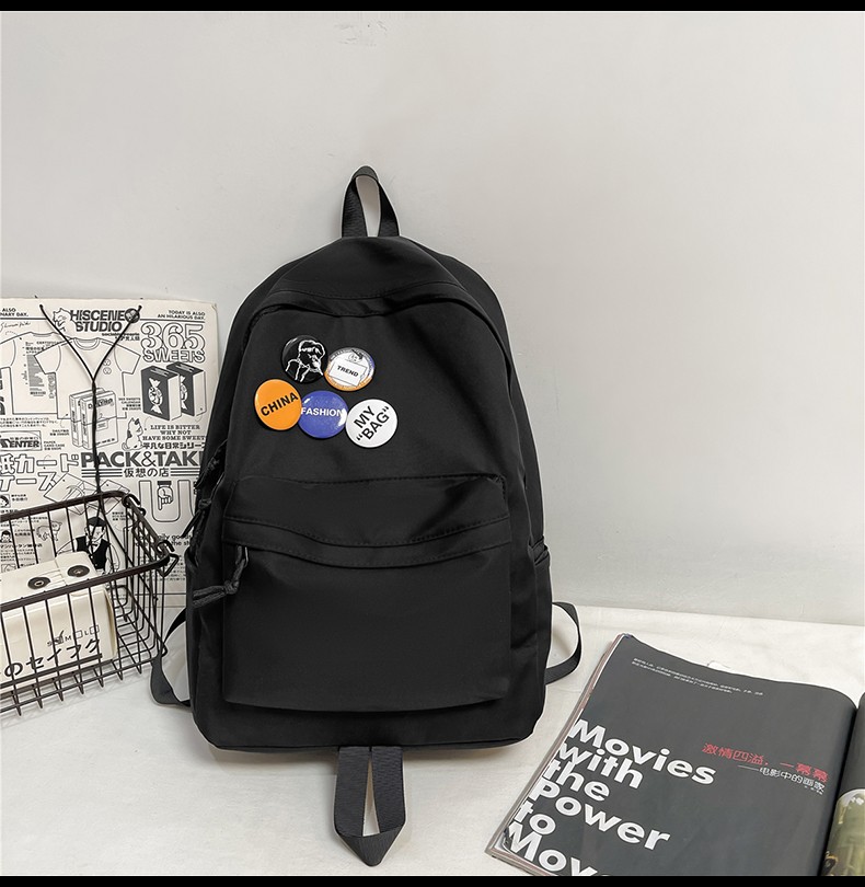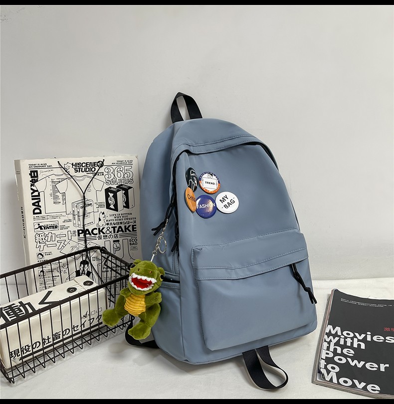 商品名称:酷森书包男初中韩版原宿风高中大学生背包 防泼水尼龙帆布大容量双肩包女 防刮耐磨笔记本电脑包 黑色(带大恐龙挂件+5枚徽章)