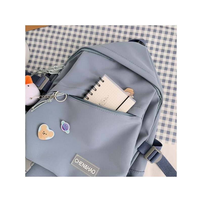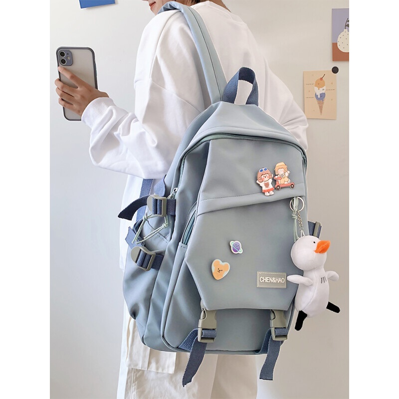 格比森书包男女韩版原宿ulzzang初高中大学生背包 尼龙帆布双肩包大容量防刮耐磨笔记本电脑包 蓝色(带鸭子挂件/带徽章)