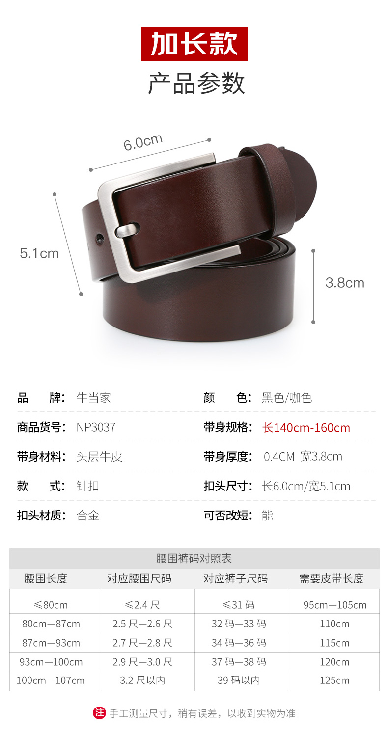商品名称:CattleOWN牛当家大码皮带男针扣牛皮腰带加长头层牛皮裤带男青年休闲百搭3037父亲节礼物 深咖色 大码135-160